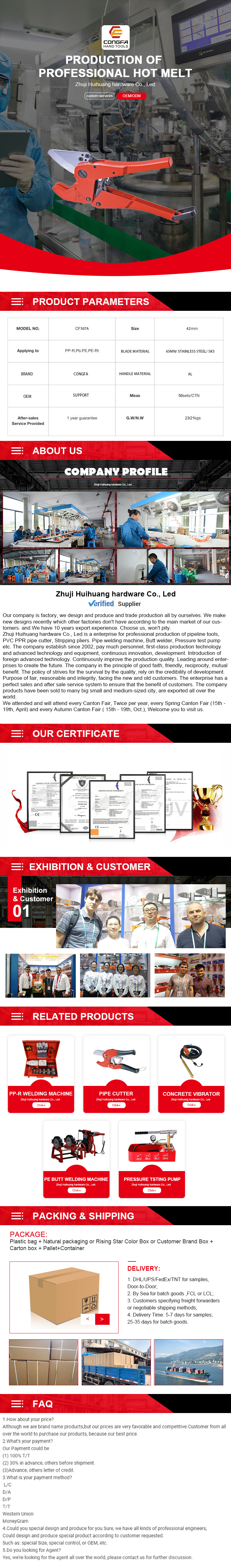 Zhuji Huihuang hardware Co., Ltd is a enterprise for professional production of pipeline tools, PVC PPR pipe cutter, Stripping pliers. Pipe welding machine, Butt welder, Pressure test pump etc.